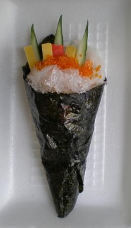 量的日式美奶滋后,卷成手卷,加上飞鱼卵点缀,即可食用.